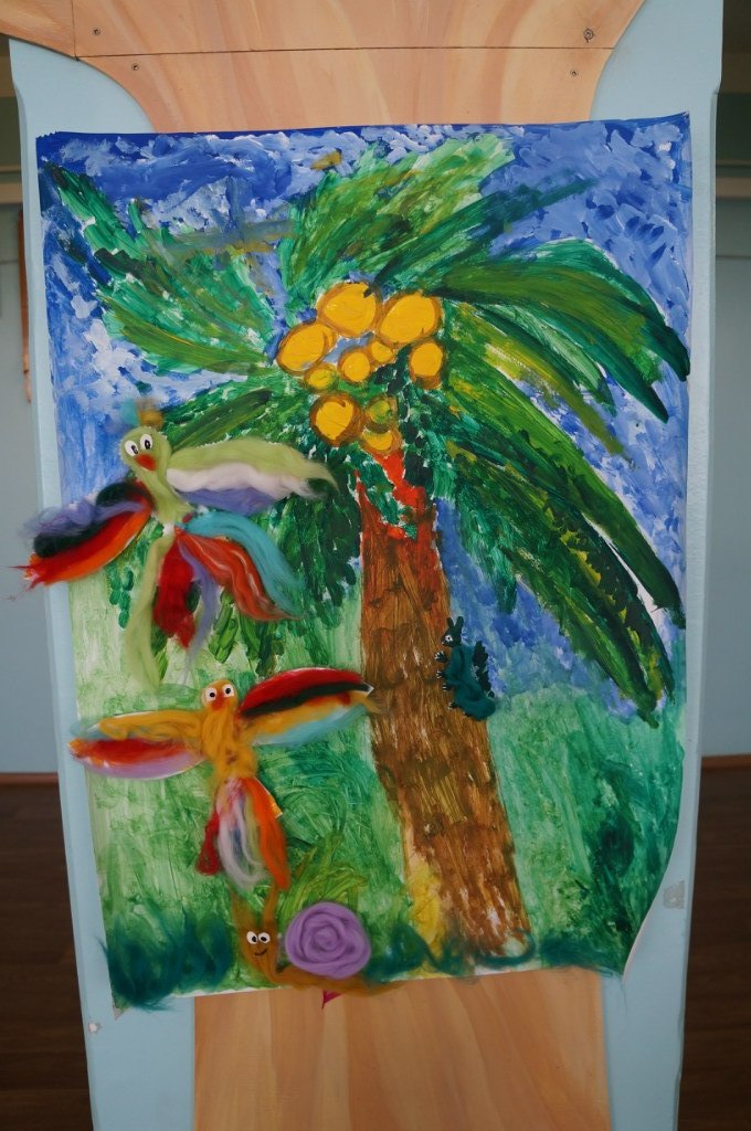 Примерно час ребята были заняты: рисовали по очереди пальму, делали попугаев, улитку и еще какого-то невиданного зверька. Как только яркая картина была готова, ее повесили в центре игровой.